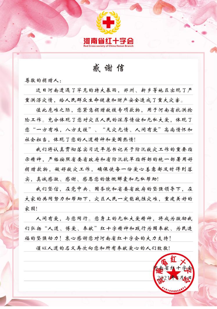 河南省因遭遇突发强降雨,郑州等地遭受特大水灾。一方有难八方支援,灾难面前,应当齐心协力,共面灾情。为帮助郑州洪灾区人民渡过危机,公司倡议全体员工向灾区伸出援助之手,奉献爱心,捐赠善款,帮助灾区人员抗洪救灾,重建家园。